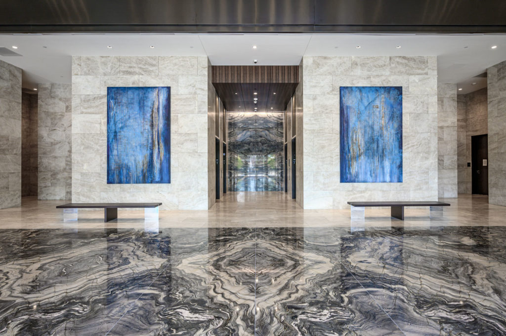 Monumental canvases in the lobby of Weir’s Plaza add bold color that enhances the stone and punctuates the stunning lobby of this Class AA tower. The amenities floor lounge features unique commissioned art to create an elevated environment to compliment the luxurious interiors.