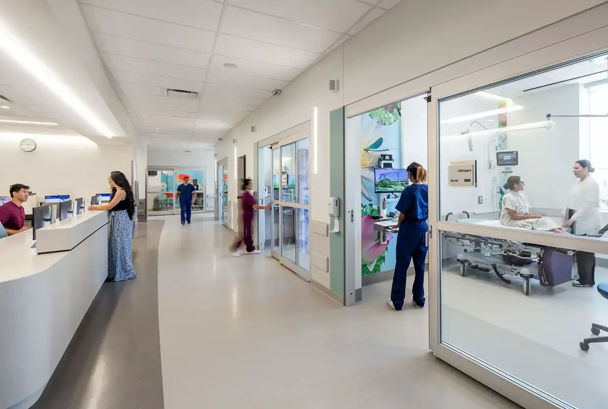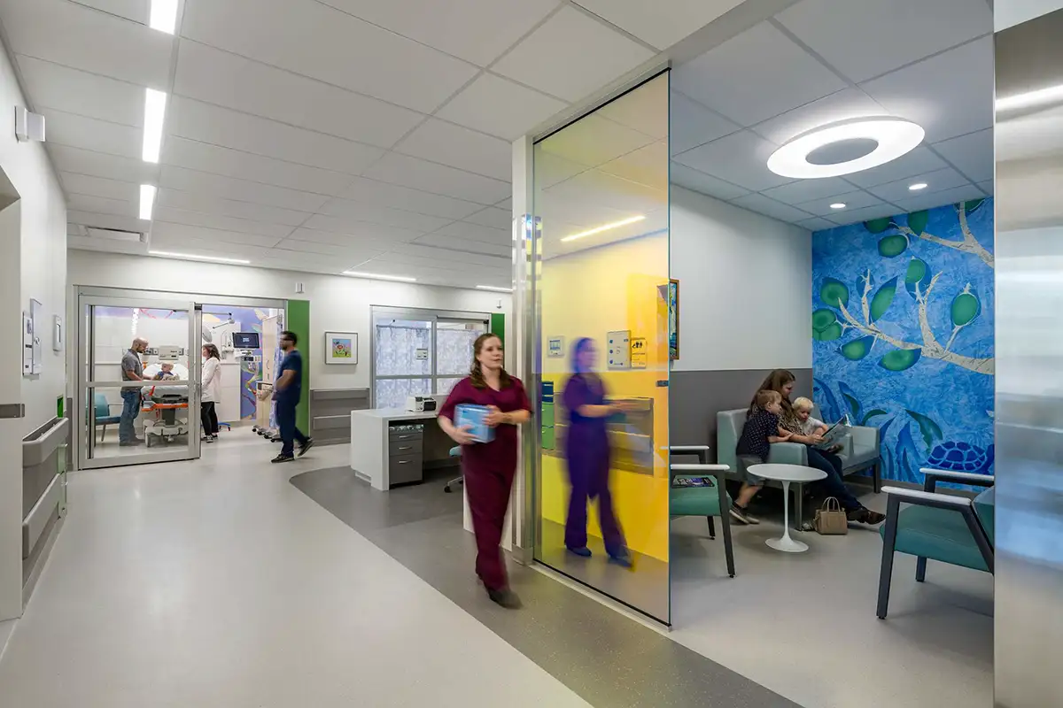 AHL: If you’ve been a patient being wheeled down the hall, it can feel like an old, scary movie where the person’s on the gurney, and they see the lights passing above their head. What you see in our hospital is a better lighting system. The lights aren‘t glaring. You see beautiful art going past you, even on the transport floors going to and from surgery.
