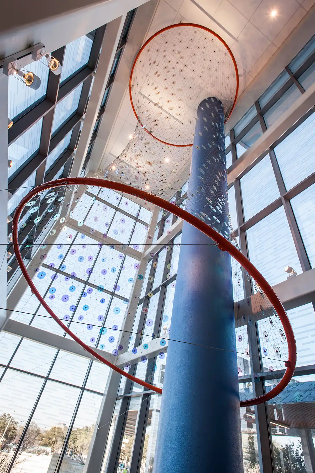 Another, called “Foxglove” by artist Ed Carpenter, is an abstract depiction of the wildflower located in the Sky Tower at University Hospital. The 15′ x 30′ x 46′ high sculpture drops down from the top of the three-story lobby. It’s made of wire net with circles of dichroic glass, a unique material that shifts colors depending on the viewer’s vantage point and the lighting. This is a feature highlighted by the terrazzo floor, also designed by Carpenter, which allows visitors to see the piece from a unique perspective.