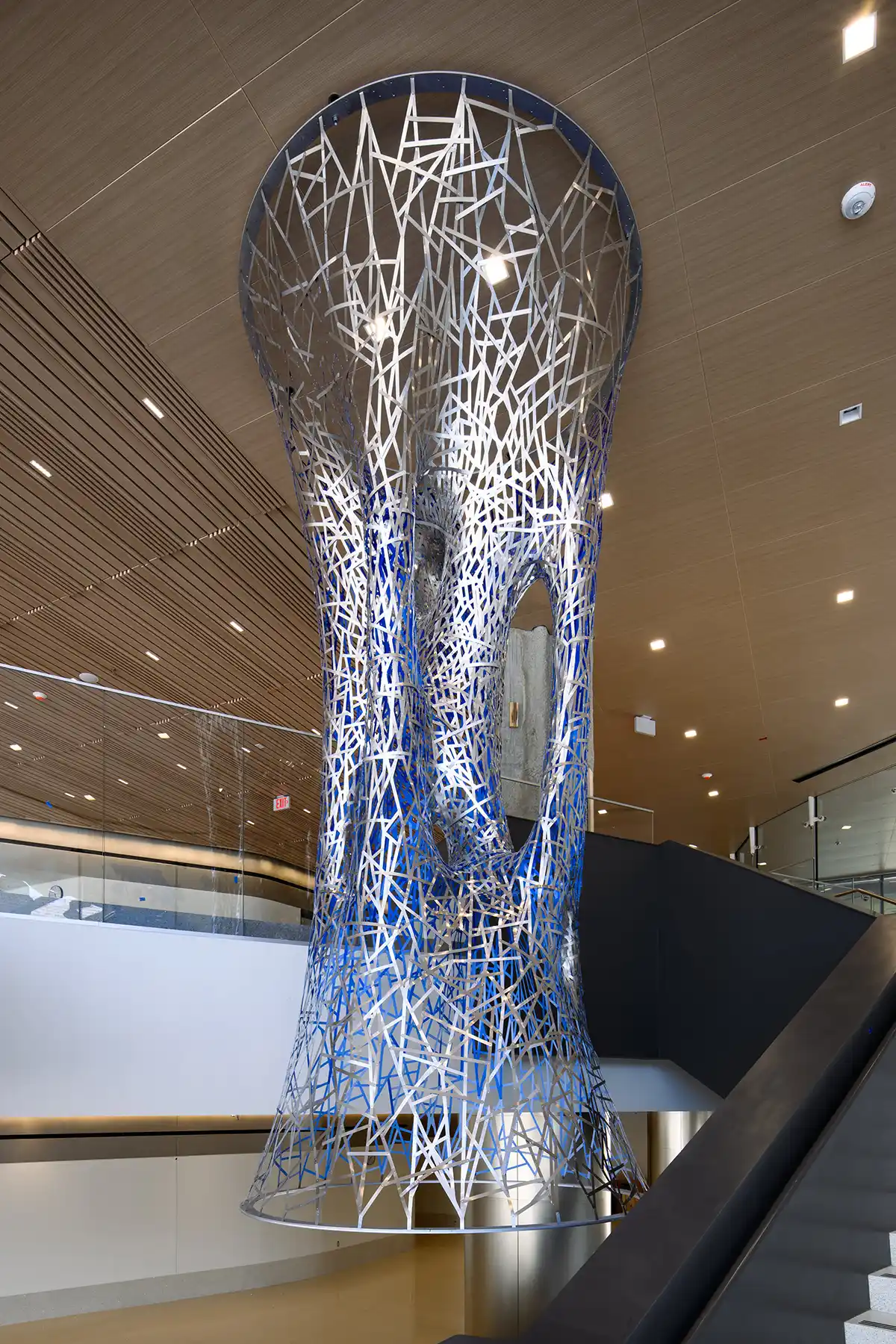 Another pillar of SaludArte Program is the large-scale, site specific sculptures they procure for University Health’s large-scale hospitals. One entitled “Nest” by artist Michael Szivos at SoftLab hangs in the 1,100 square-foot atrium in the middle of the grand staircase at University Health Women’s and Children’s Hospital. The structure is 8’x 8’x 18’ and is made of linear pieces of laser-cut aluminum assembled in a woven pattern much like a bird’s nest. It was a 2023 CODAwards Merit Winner for Healthcare Interiors.